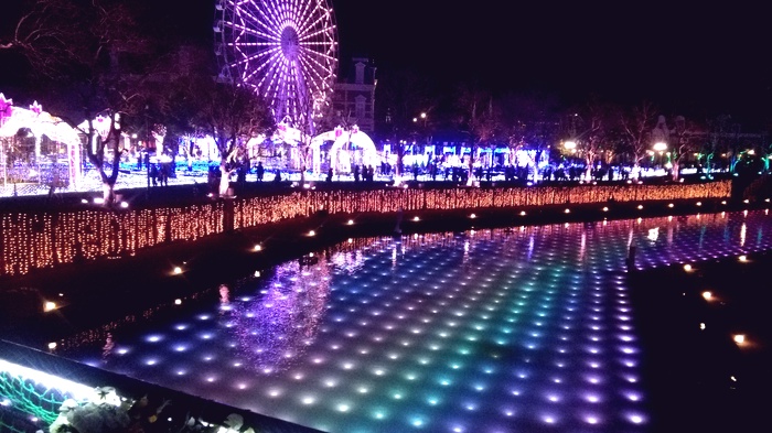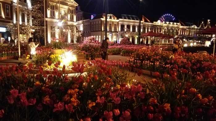 で、チューリップを楽しみ、オランダ風建築を楽しみ、派手派手イルミネーションの呆然とし。